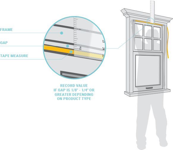Example: The frame has a 9/32" thick inward gap on the left side, three inches from the bottom left hand corner of the sill.