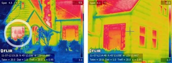 Heat is quickly lost through windows in cold weather. In the thermal images below, the circled window does not have an Indow insert installed. The window to the right, with an insert in place, is a much darker red – this indicates higher warmth, and less heat loss.